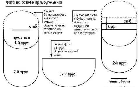 Для раскроя свадебной фаты используются две основных геометрических формы: прямоугольник и овал, а также их комбинации и частные случаи. Например, круг, часть круга, часть овала, квадрат, прямоугольник со скругленными краями и т.д. При любой из этих форм фата может быть выкроена как в один слой, так и в несколько слоев-ярусов различной длины. Принципиальные различия в разных покроях фаты касаются всего двух вещей - наличия (или отсутствия) сборки и разметки места для нее на раскроенных деталях.