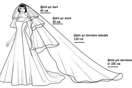 Прежде чем приступить к изготовлению фаты, необходимо определиться с длиной. Она зависит от фасона свадебного платья и личных предпочтений невесты. Длина до плеч (55-65 сантиметров), до уровня локтей (75-85 сантиметров), до пальцев (100-120 сантиметров), свободный шлейф (более2 метров).