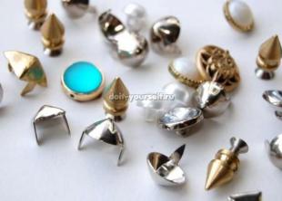 Шипы (справа) легко прикрепить через ткань с помощью винтов. Заклепки (в середине) имеют зубцы, которые легко протыкают ткань и зажимаются плоскогубцами. Пуговицы - жемчужины (слева) пришиваются нитками.