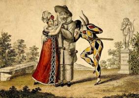 Карнавальные костюма XVIII века представляют собой наряды, почерпнутые из комедий французского народного театра и итальянской дель арте. Во время маскарада улицы были заполнены бесчисленными Пьеро, Коломбинами, Арлекинами и Скарамушами.