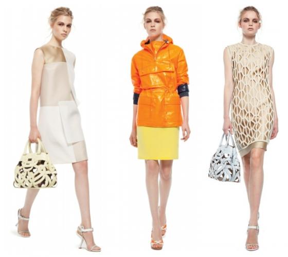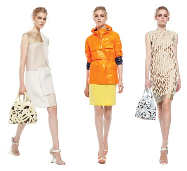Весна и лето в стиле культовой итальянской марки будет ярким и контрастным. Первые наряды коллекции — это сплошное изумление мастерству комбинирования цветов. Четыре интенсивных и совершенно самостоятельных деталей образа, как по волшебству сливаются воедино. Сиреневый топ в тандеме с брюками оттенка морской волны — достаточно предсказуемый дуэт ярких красок, но оранжевый пиджак и золотые аксессуары заставляют комплект смотреться по-особенному. Связующим звеном этого буйства цвета является одинаковая фактура тканей. Именно она делает весь образ цельным и элегантным.