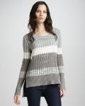 Фасоны женского свитера 2013-2014 разнятся множеством деталей. Это и свитера с молниями, как у горловин, так и внизу наряда, с асимметричными деталями. А также наряды с воротником-хомутом и свитера с высоким горлом, V-вырезом. В моде также реглан или свитер-кофта.