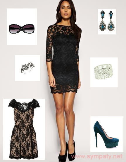 Черное кружевное платье может сделать из вас роковую красотку или женщину-вамп. Подберите босоножки или туфли на каблуке (можно черного цвета, а можно подобрать другой расцветки) и какой-нибудь аксессуар, например, бусы или серьги или красивый браслет.