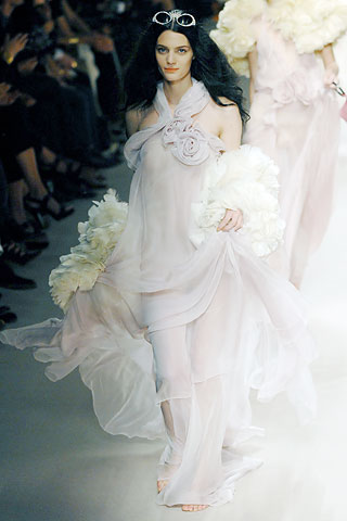 Популярные материалы для вечерних платьев – шелк, атлас и шифон. Что касается расцветки, то предпочтение следует отдать или однотонным моделям или нарядам с цветочным принтом (это один из хитов сезона). Все еще популярны «хищные» принты – их можно найти в коллекции Blumarine.
