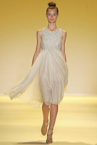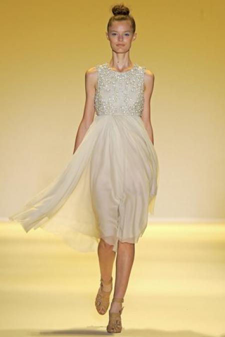 В коллекциях мировых дизайнеров одежда для беременных 2012 представлена повседневными платьями и сарафанами, сочетающими плотную гладкую ткань с блестящим прозрачным шифоном. Они выдержанны в светло- бежевой, песочной и белой цветовой гамме, декорированы кружевом и рюшами. Идеальным вечерним туалетом станет прекрасное платье до колен, с украшением в виде камней.