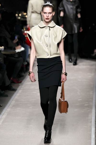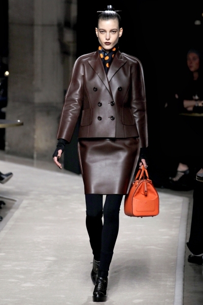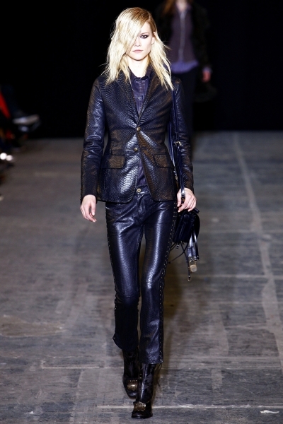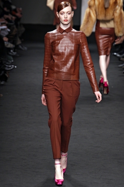 В этом сезоне дизайнеры решили использовать кожу рептилии по полной программе. Можно было увидеть и сумки, и туфли, и платья, и пальто, выполненные из кожи рептилий, а некоторые дизайнеры представили кожу питона в виде принтов на платьях и юбках. Поэтому нет ничего удивительного в том, что эта тенденция добралась и до жакетов с топами. Gucci представил потрясающий изумрудный жакет из кожи питона, более спокойные варианты в коричневых тонах есть у Brioni и Diesel Black Gold.