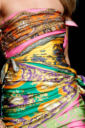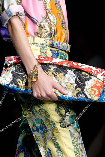 Но вернемся к весенней коллекции D&G, мы уже успели отметить ранее, что шоу было очень красочным. Девушки с головы до ног были одеты в шелковые платки, включая сумочки и обувь.