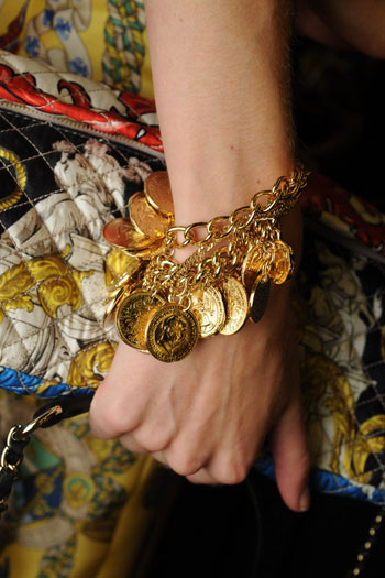 Средиземноморские мотивы на рисунках шелковых платков были дополнены золотыми ожерельями, браслетами и серьгами из цепочек и монет.