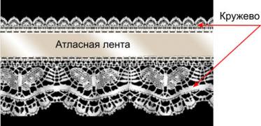 3.Поверх основы с нашитым кружевом накладываем второй кусок атласной ленты и пришиваем.