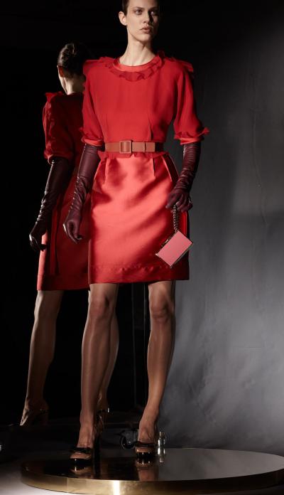 Платья Lanvin осень 2012 очень разные. Есть и романтические открытые с деталями в виде воланов, есть и сверкающие мини в сочетании с длинными перчатками и поясом из красной лакированной кожи, также длинные вечерние платья зеленого и синего цветов с длинным ожерельем из камней, а также прекрасное черное платье из органзы.
