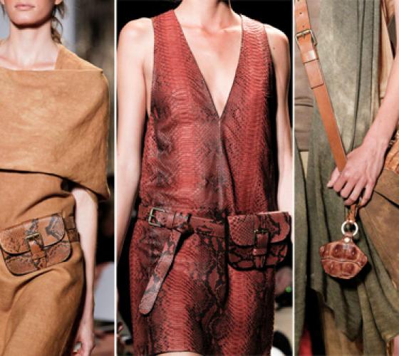 Сумки в коллекции Michael Kors весна-лето 2012 выглядели еще более впечатляющими. Пример – сумка из крокодиловой кожи с ремнями, которая, наверное, отпугнет элегантную даму. Однако в коллекции она смотрится очень гармонично. Кошельки на талию перекочевали в весеннее-летнюю коллекцию.