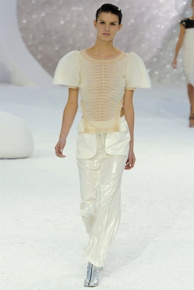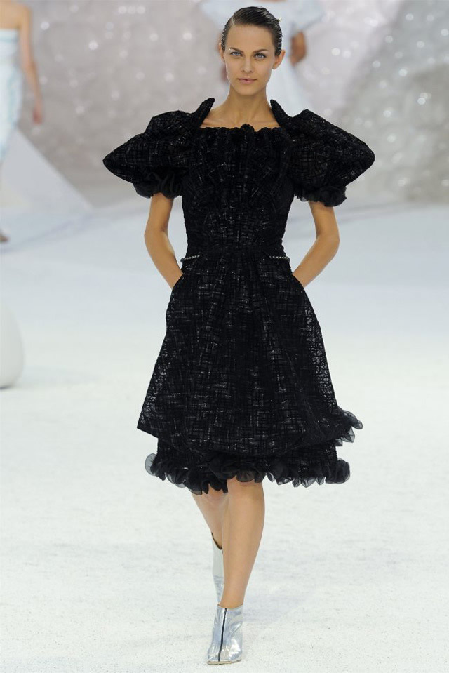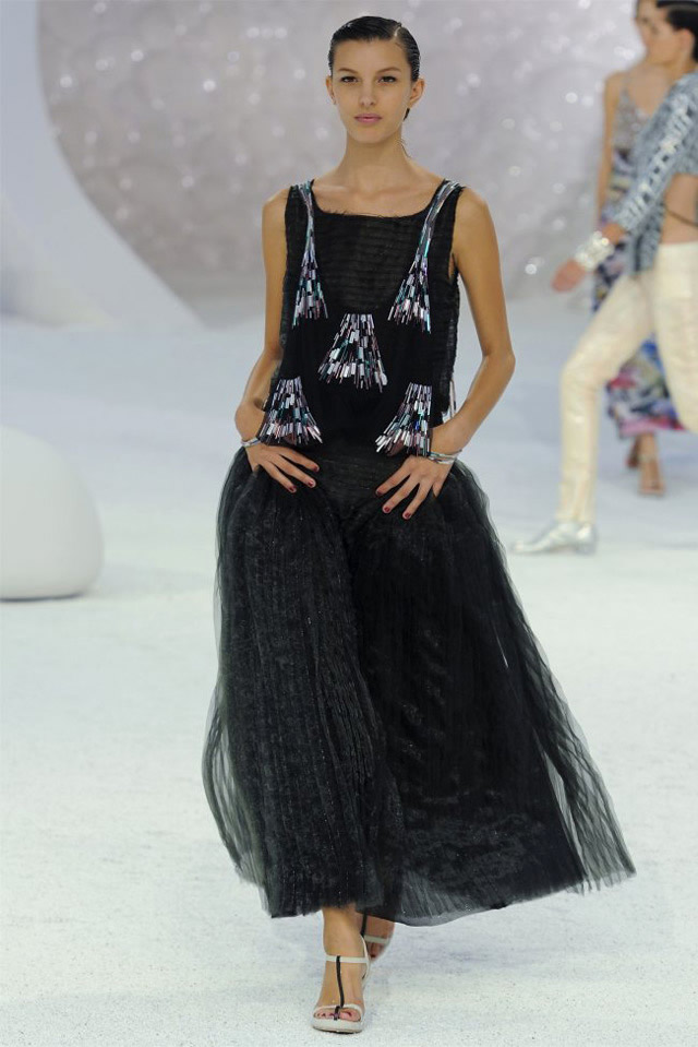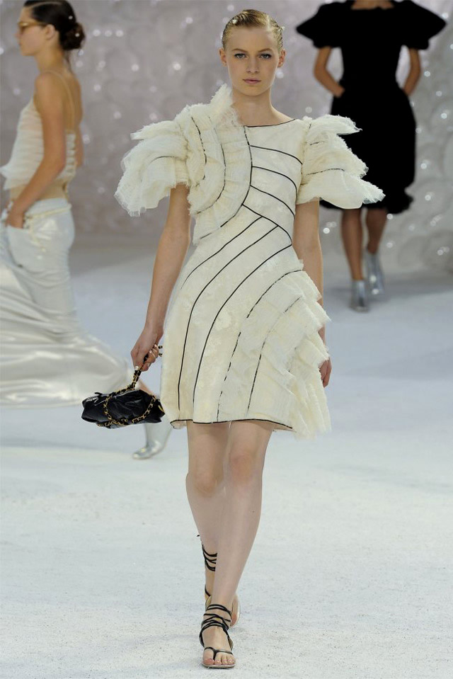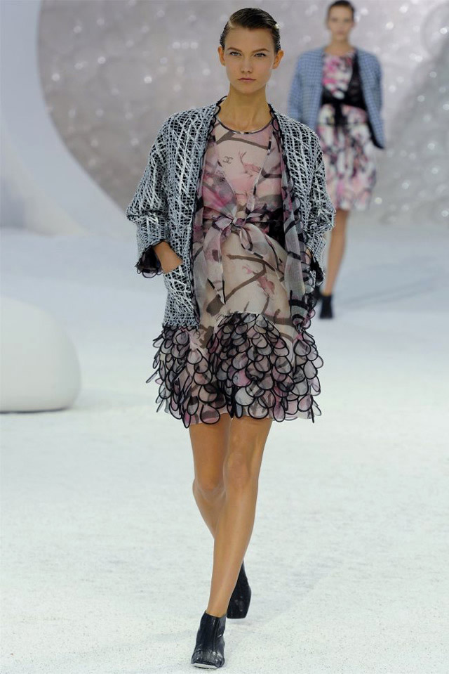В коллекции Chanel весна-лето 2012 преобладает женственность и шик. Карл Лагерфельд использовал новые ткани, которые потрясающе сияли при тусклом свете. Силуэты не всегда были в обтяжку, но даже будучи свободными, они хорошо смотрятся на фигуре женщины.
