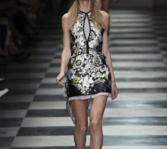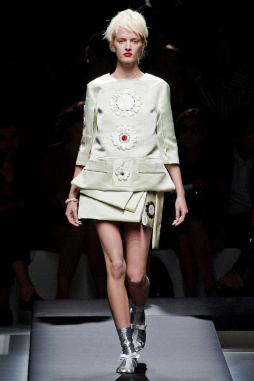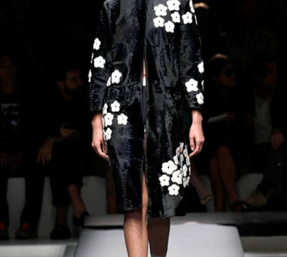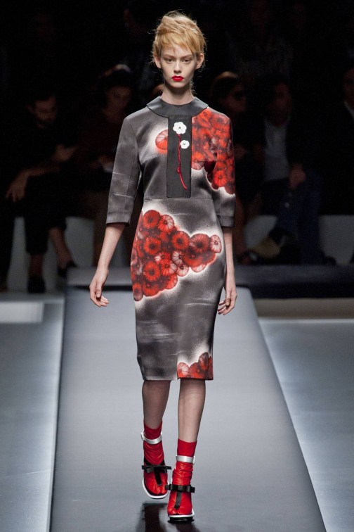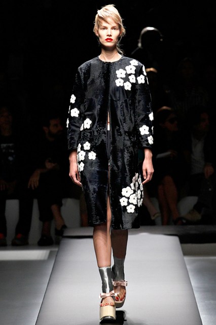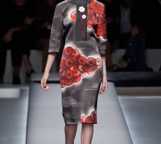 Прошёл без преувеличения один из главных показов не только миланской недели моды, но и будущего весенне-летнего сезона. Миучча Прада не следует популярным модным веяниям, она создает тенденции. Современная интерпретация японского костюма — кимоно и обуви гэта. По подиуму одна за другой спускались модели в минималистичных чёрных платьях прямого силуэта с лаконичными принтами в виде белых цветов.
