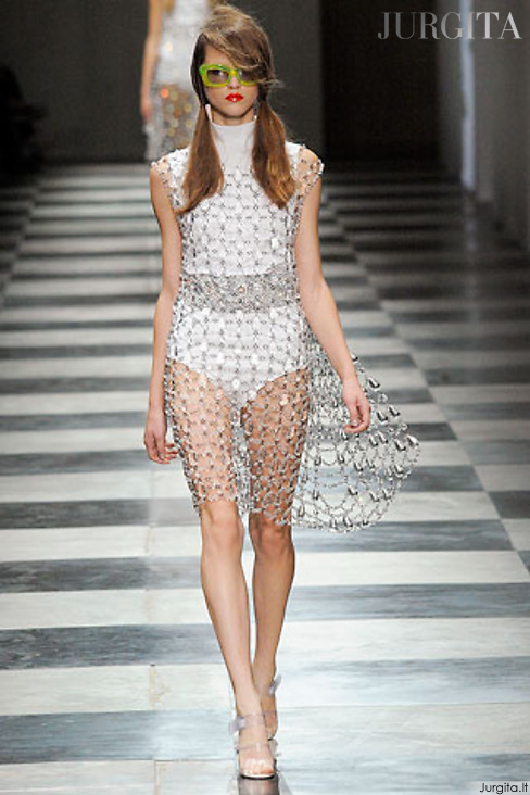 Что касается второй части шоу, то она была не менее потрясающей, благодаря представленным куркам, украшенным драгоценными камнями на плечах и воротниках. Эти наряды выглядели более правдоподобно и практично. Чем все остальное, представленное Prada в сезоне весна-лето 2012.