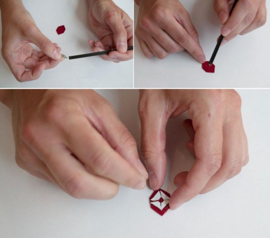 … а потом наклеить эту мелочь на красный шестиугольник, опять сформировав ромб. Это чтобы шовчики имитировать, наверное. Мой вариант — белый ромб не резать, а нашить на красные детали, тогда и шов будет настоящий, и с приклеиванием мелочёвки не придётся париться.