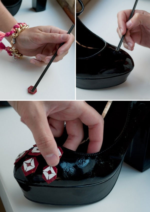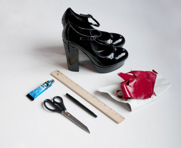 Нужны туфли, похожие по форме на источник, ножницы, два лоскута кожи (красной и белой), линейка, клей, маркер для обводки элементов на коже.