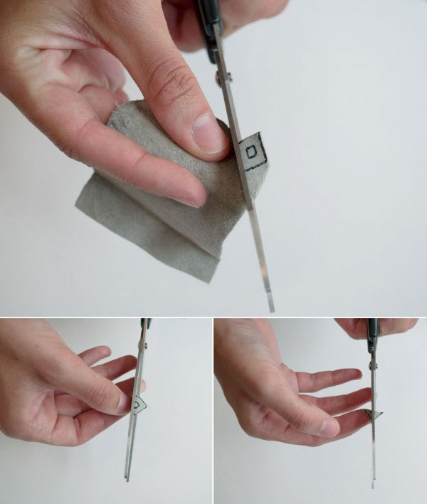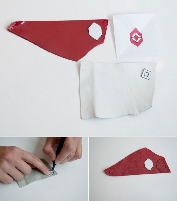 По линейке рисуем эскиз на бумаге. Вырезаем из бумаги шаблоны (белый ромб и красный шестиугольник), обводим их на коже.