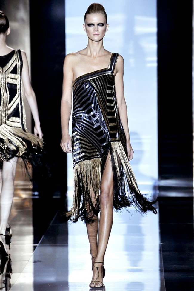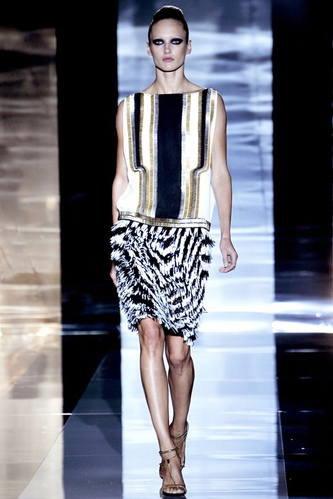 Модные вещи весна 2012 от Gucci были полны пересекающихся линий и полос, геометрические узоры можно было также видеть на платьях и пиджаках. Бахрома появилась в этой коллекции в виде длинного в пол шелка, на котором в виде капель были пришиты бусы на нитях. Смелый зеленый, богатый золотой, потрясающий серебряный перенесли эту коллекцию в сумерки, где наряды превращались в частичку живой природы.