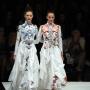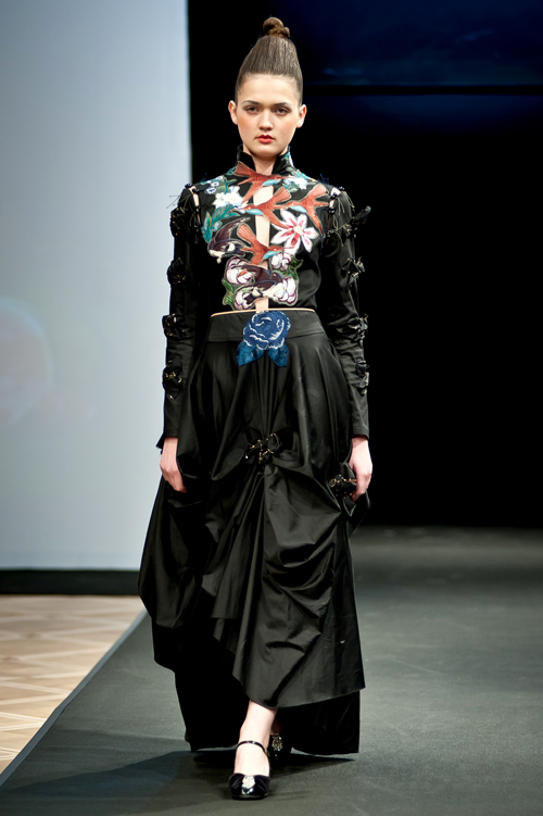 Одежды из коллекции – в основном, черного или белого цвета, но пиршество вышитых яркой шелковой гладью цветов создает ощущение наипраздничное, что получает развитие в отдельном неожиданном красном платье с голубой юбкой. Красота нарядов ошеломляет именно тем, что нет приторности – это настоящее умение соединять, как в букете, собираемом самостоятельно – цветок к цветку, создавая феерию неспешно-роскошных сочетаний! А драгоценные каменья, щедро рассыпанные по ткани, на таких одеяниях намекают на их, несомненно, магические свойства.