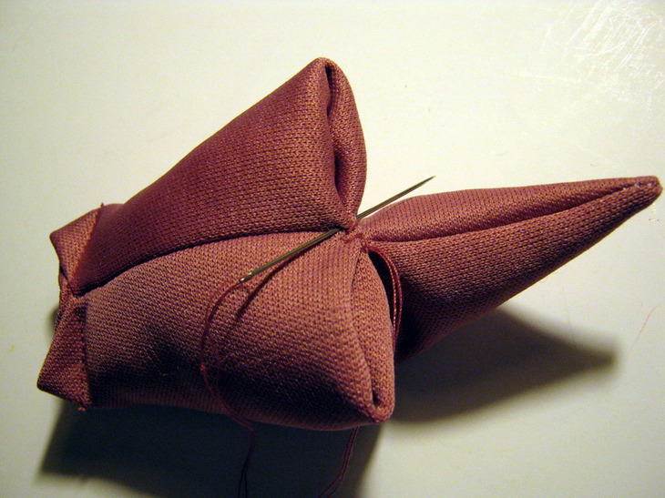 8 Подогнув нижние припуски вовнутрь, соединить сначала переднюю и заднюю половины и скрепить ниткой в середине, потом сложить "кармашки" еще раз пополам, сформировав ножки и закрепить ниткой