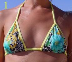 Чтобы легче рассчитать размер и правильно сделать выкройку, можно воспользоваться своими старыми, любимыми трусиками. Распорите их по швам, перенесите эскиз на подготовленный материал. Что касается лифа, то здесь можно использовать полиэтиленовые либо поролоновые чашечки, которые подходят вам по размеру. Их нужно наложить на ткань и обвести, не забывая о припусках в 1 см. Бретельки следует кроить по косой шириной около 3 см, чтобы в готовом виде они получились в сантиметр. Длина бретелей составляет около 1,2 метра. Материал для бретелей можно выбрать контрастным по отношению к основной ткани – у нас это желтый (рис. 1).