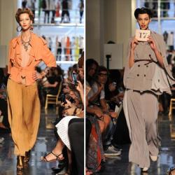 Модели с ульями, красивыми пятнами и драматическим макияжем выходили на подиум в платьях стиля эпохи 50-ых годов прошлого столетия, крошечные корсеты и боди, блестящие юбки-карандаши и простые футболки, стильные костюмы и невычурные туники – все это можно было увидеть на показе Paul Gaultier весна 2012.