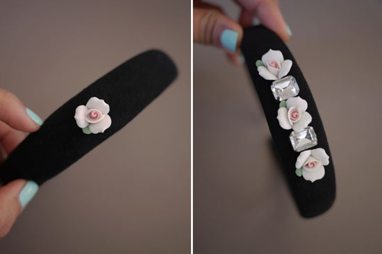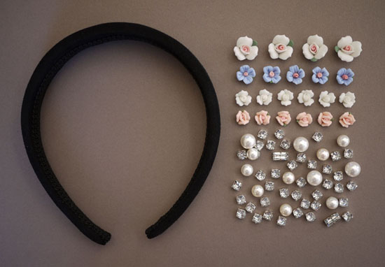 всевозможные украшения для нашего ободка: стразы, камни, жемчуг, керамические или металлические цветочки.