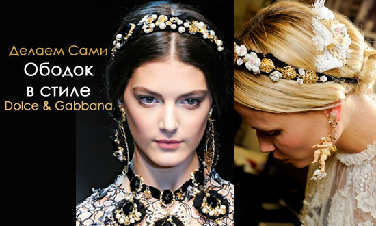 Хотите всегда быть в тренде? Мечтаете о каком-нибудь супер модном аксессуаре? Как насчет стильного и необычайно красивого ободка из осенней коллекции Dolce & Gabbana 2012. Предлагаем вам сделать эту новомодную вещичку своими руками. С помощью подобранных нами фото и видео мастер классов выполнить эту задачу вам будет просто необыкновенно просто. Очень надеюсь, что вам понравится обладать таким роскошным ободком.